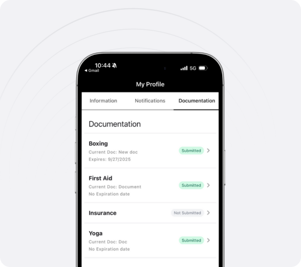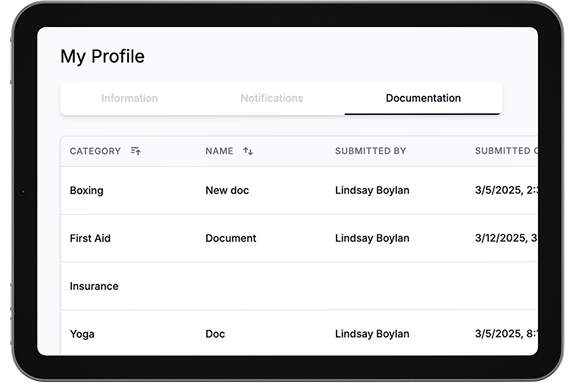 Tired of chasing and manually organizing staff credentials during hiring, onboarding, and ongoing employment? Collect, track, and store critical documents—like CPR certifications, insurance, and training qualifications—right inside NetGym. Reduce your workload and gain peace of mind knowing all essential employment documentation has been collected and renewal reminders are in place.