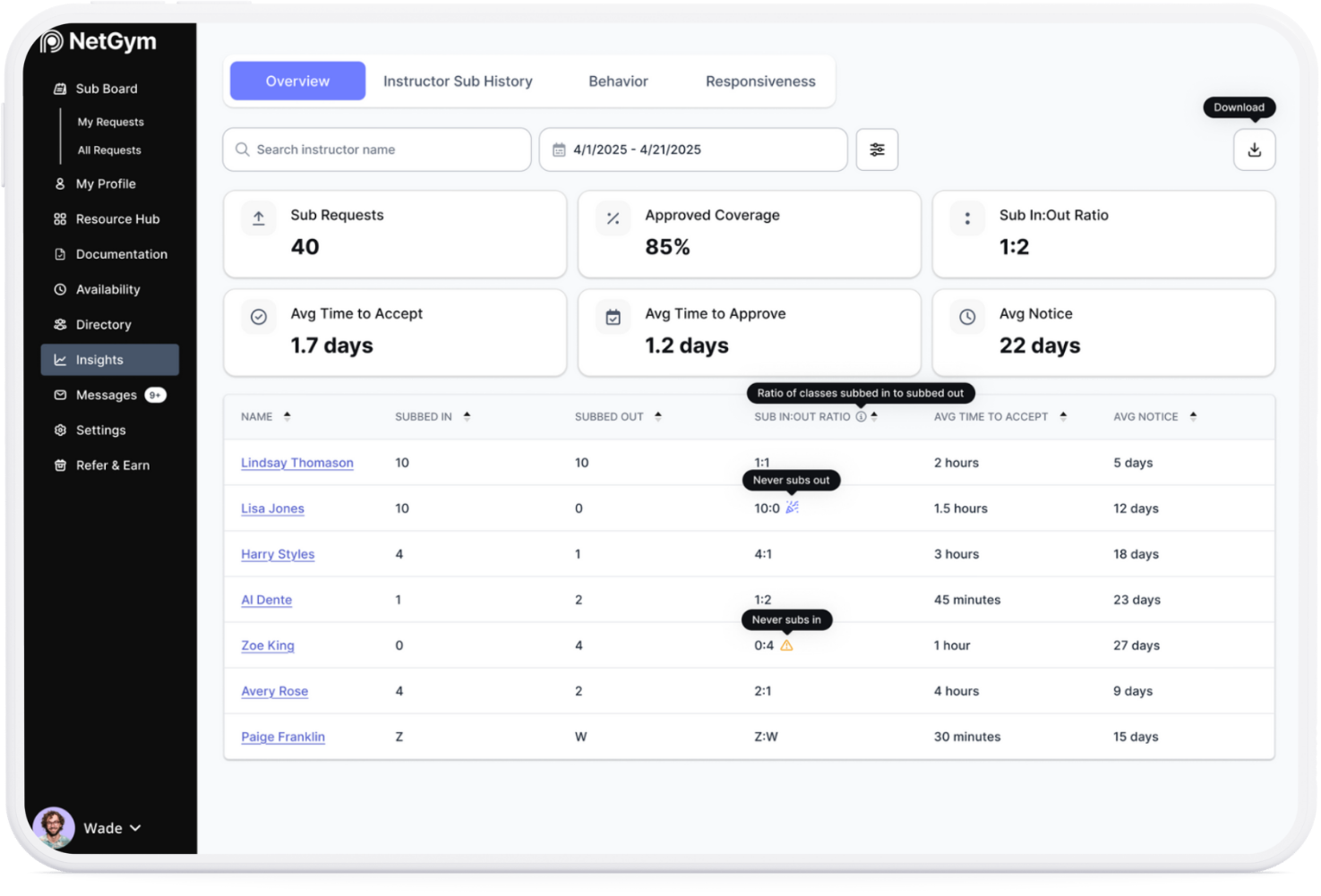 At fitness studios and gyms, an instructor’s sub in:sub out rate (how often they cover classes vs. how often they give them up) can serve as an early indicator of well-being and engagement. A consistently low rate, where an instructor is giving away more classes than they’re picking up, may suggest: